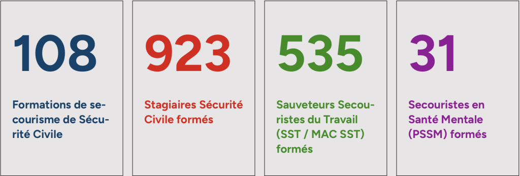 Notre équipe de formateurs est intervenue en Gironde auprès du grand public, mais aussi au sein d'entreprises ou de collectivités pour l'enseignement des différentes formations de secourisme : Premiers Secours Citoyen(PSC), Premiers Secours en Équipe de niveau 1 ou 2(PSE 1 ; PSE 2), Sensibilisation aux Gestes qui Sauvent(GQS), Sauvetage Secourisme du Travail (SST / MAC SST), Premiers Secours en Santé Mentale (PSSM).
